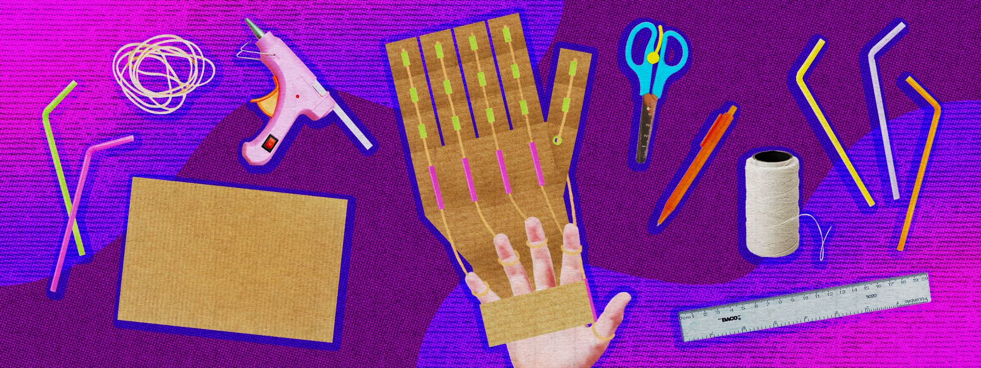 - Introduce el hilo por cada popote desde la parte superior hasta los popotes pegados en la palma de la mano de cartón. Amárralos arriba para asegurar que no se salgan y corta el exceso. Y en la parte inferior toma la medida haciendo un nudo que forme un aro donde podrás introducir tus dedos para controlar la mano robótica.